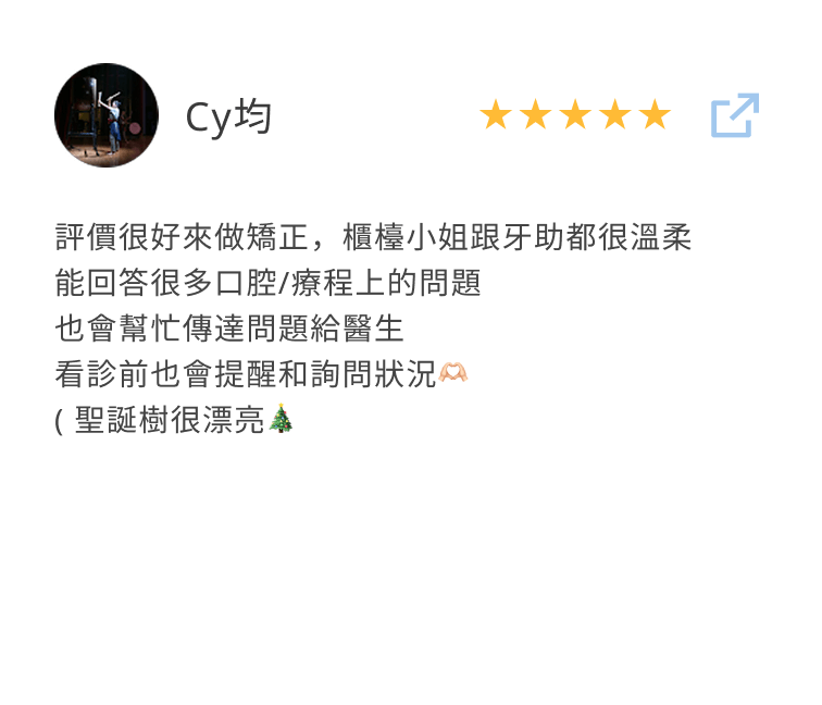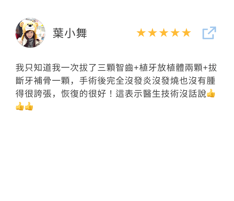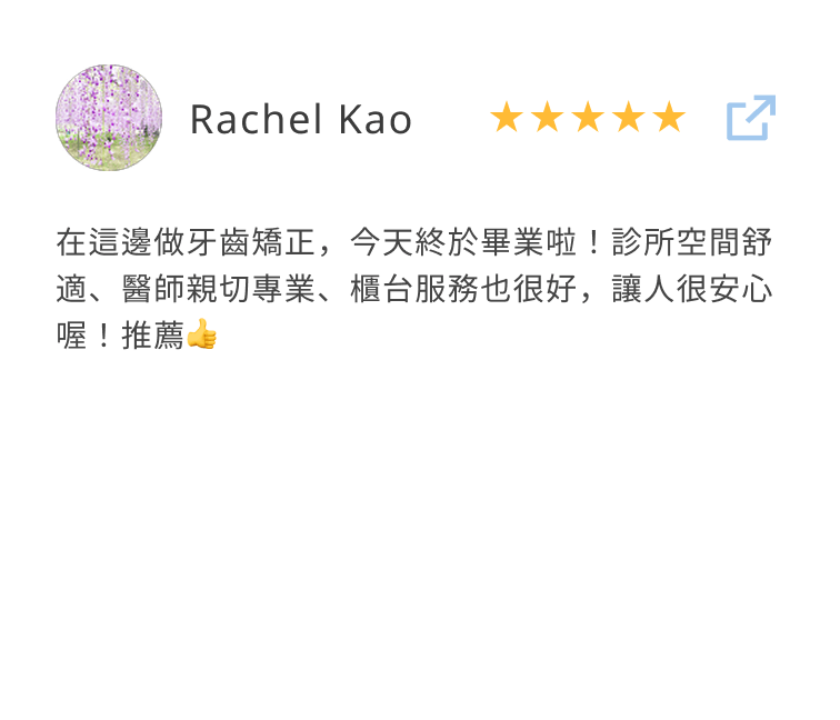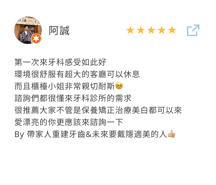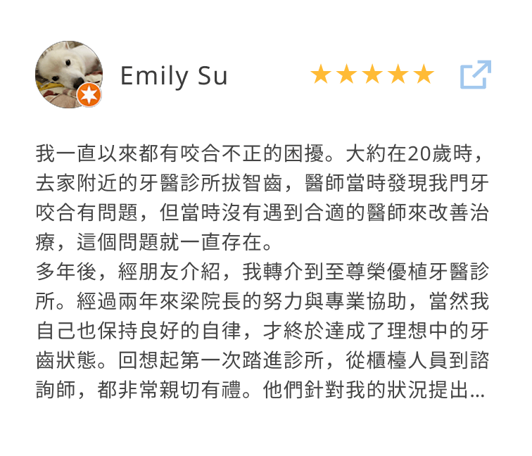 療程結束後,他在社群上開心發文:「真是愉快的一天~~~謝謝院長把我牙齒弄的那麼好,也謝謝兩位專業的妹妹!」簡單幾句話,讓人感受到他當天的好心情。這次療程不只讓咬合恢復自然,也讓他的笑容多了幾分自在與自信。