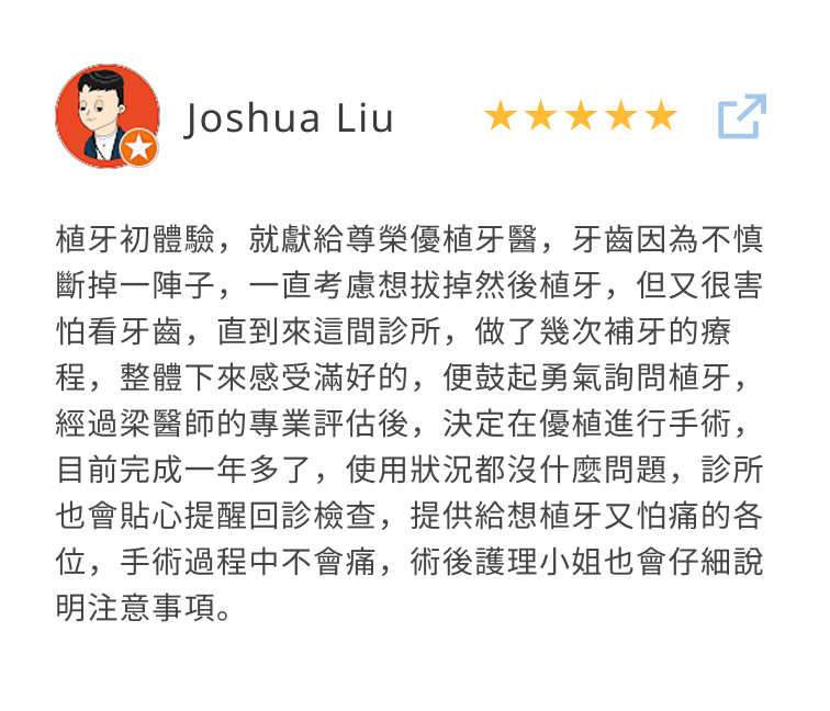 因為缺牙問題,李睿紳特地來到尊榮優植牙醫,由梁院長親自進行微創植牙療程。從初診到手術當天,他都非常親切,現場氣氛也輕鬆愉快。